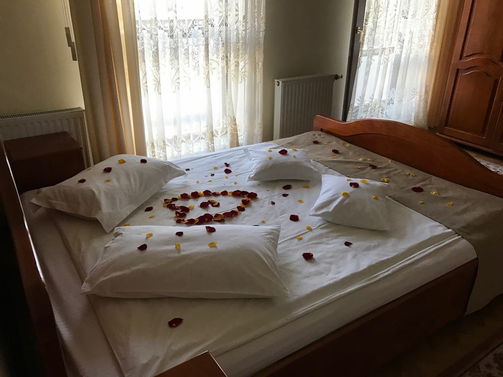 De la început suntem plăcut surprinși: la cazare un domn foarte amabil, atent, cu zâmbetul pe buze ne urează bun venit și casă de piatră. Urcăm la primul etaj unde avem rezervată camera îndrăgostiților, care arată cam așa: